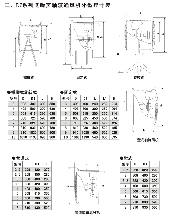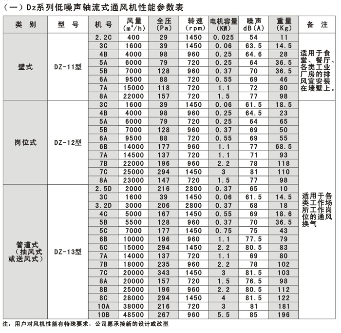 特性及应用 Dz系列通风机采用从声源入手,低转速,高压力系数的设计方法,研制成宽叶片,大弦长,空间扭曲倾斜式叶型,配用风机专用电机,具有明显的噪声低,风量大,耗电省,振动小,外形美观等优点,是一种高效,节能型轴流风机。广泛适用于厂房,仓库,办公室,住宅等场所的壁式排风,管道送风。 本系列风机有三种型式::DZ-11型壁式,DZ-12型岗位式,ZD-13管道式。特殊场合按用户要求可加式成网罩,弯头或自垂百叶形式工。 本系列风机一般配用三相电机,按用户要求对0.55KW以下可配用单相电机。可根据输送介质要求制成防腐,防爆型:FDZ为防腐型轴流通风机,用于输送有腐蚀性的气体;BDZ为防爆型轴流通风机,用于输送易燃易爆的气体。FBDZ为防腐防爆型轴流通风机,用于输送有腐蚀性且易燃易爆的气体。![]()